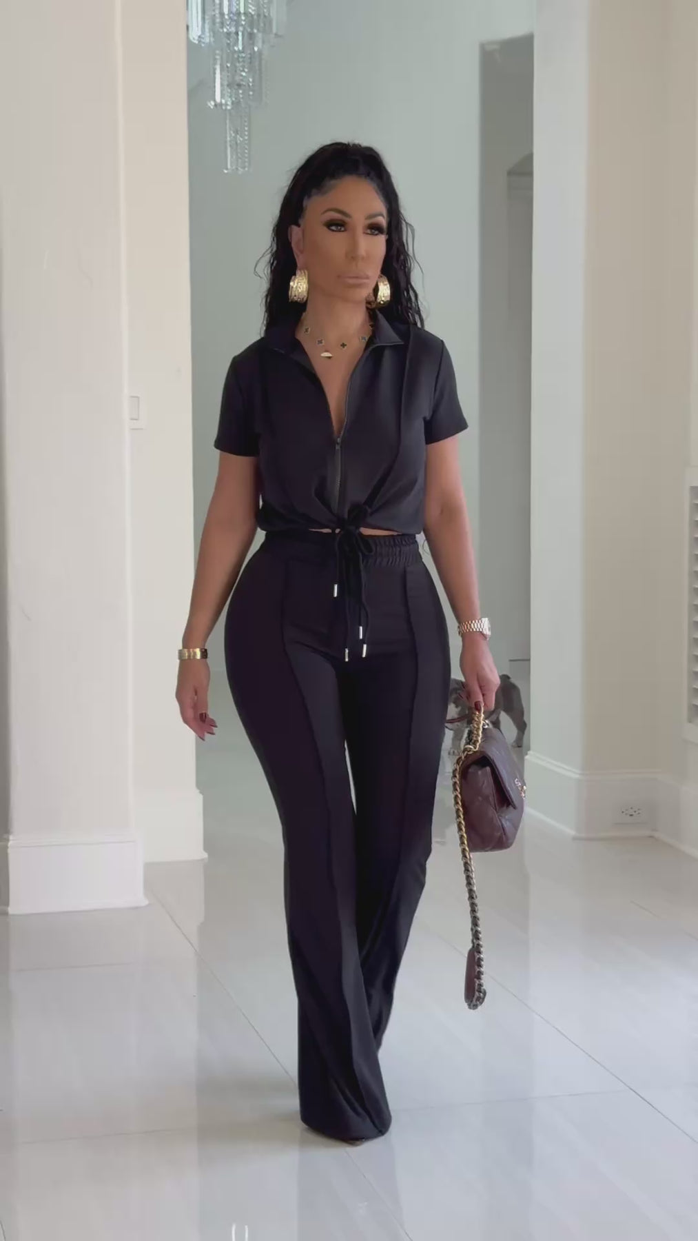 - Short Sleeve Zippered Collar Top with Tie Waist Flared Bottoms