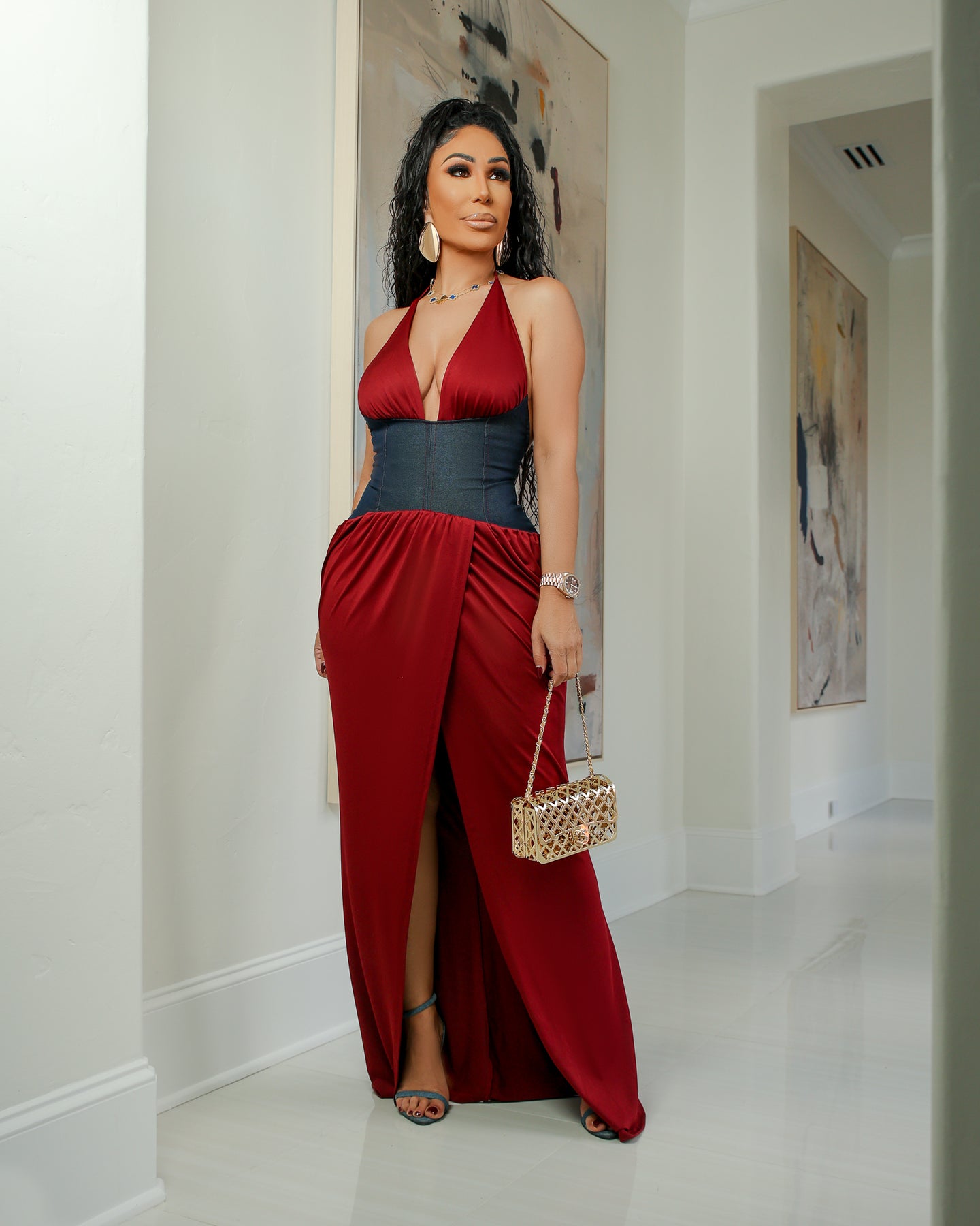 - Halter Dress with Deep V-Neck Denim Waistline and Merlot Contrast