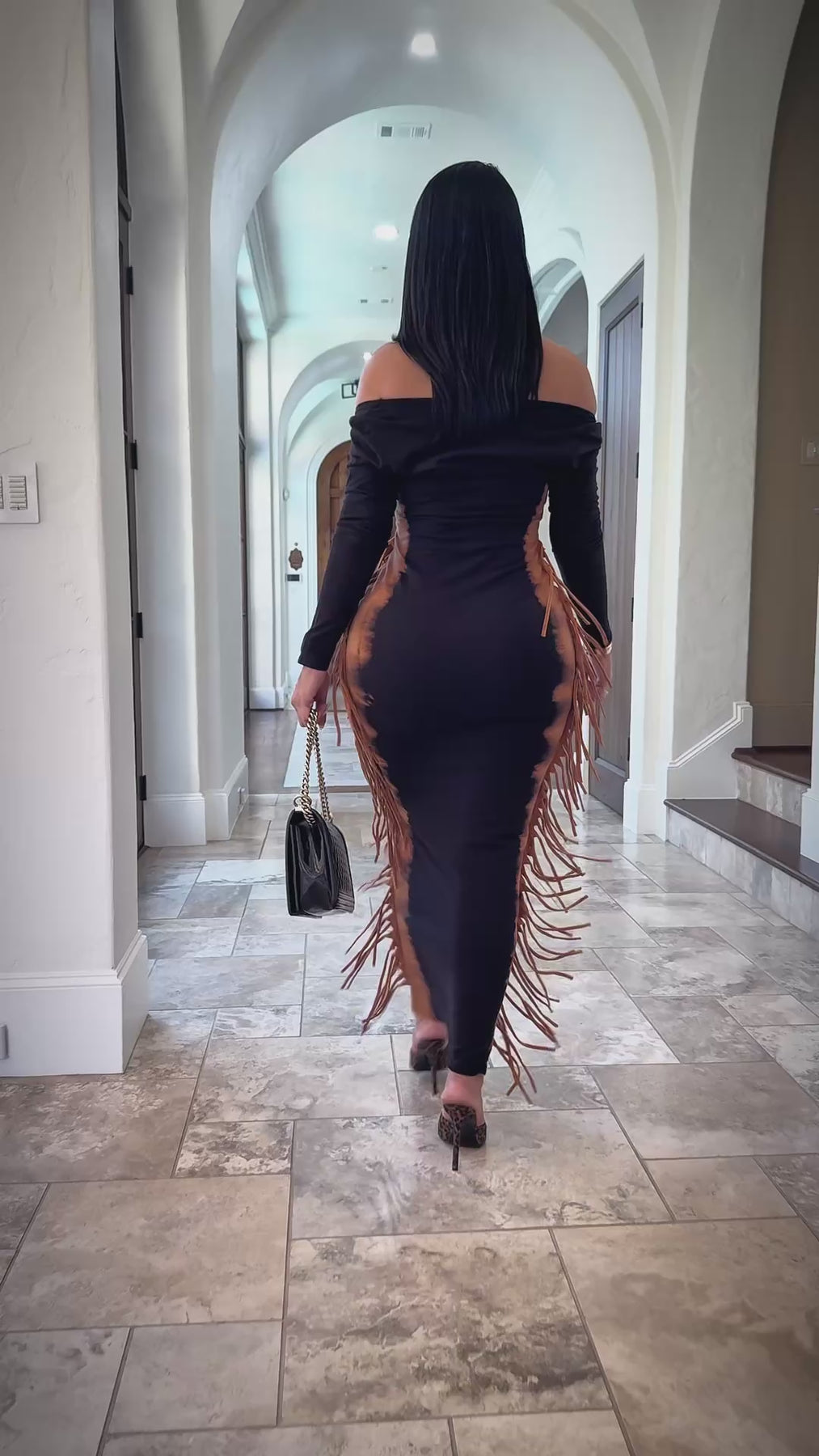 - Bleached Two Tone Long Sleeve Fringe Maxi Dress
