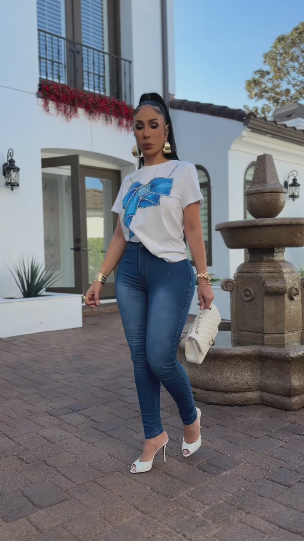 White short-sleeve t-shirt featuring a rhinestone bow detail and a soft, flattering fit.