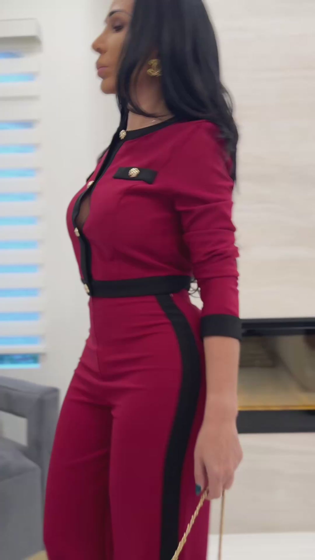 - Two-piece set featuring a cropped button-up jacket with black trim and matching high-waisted pants with black side panels.