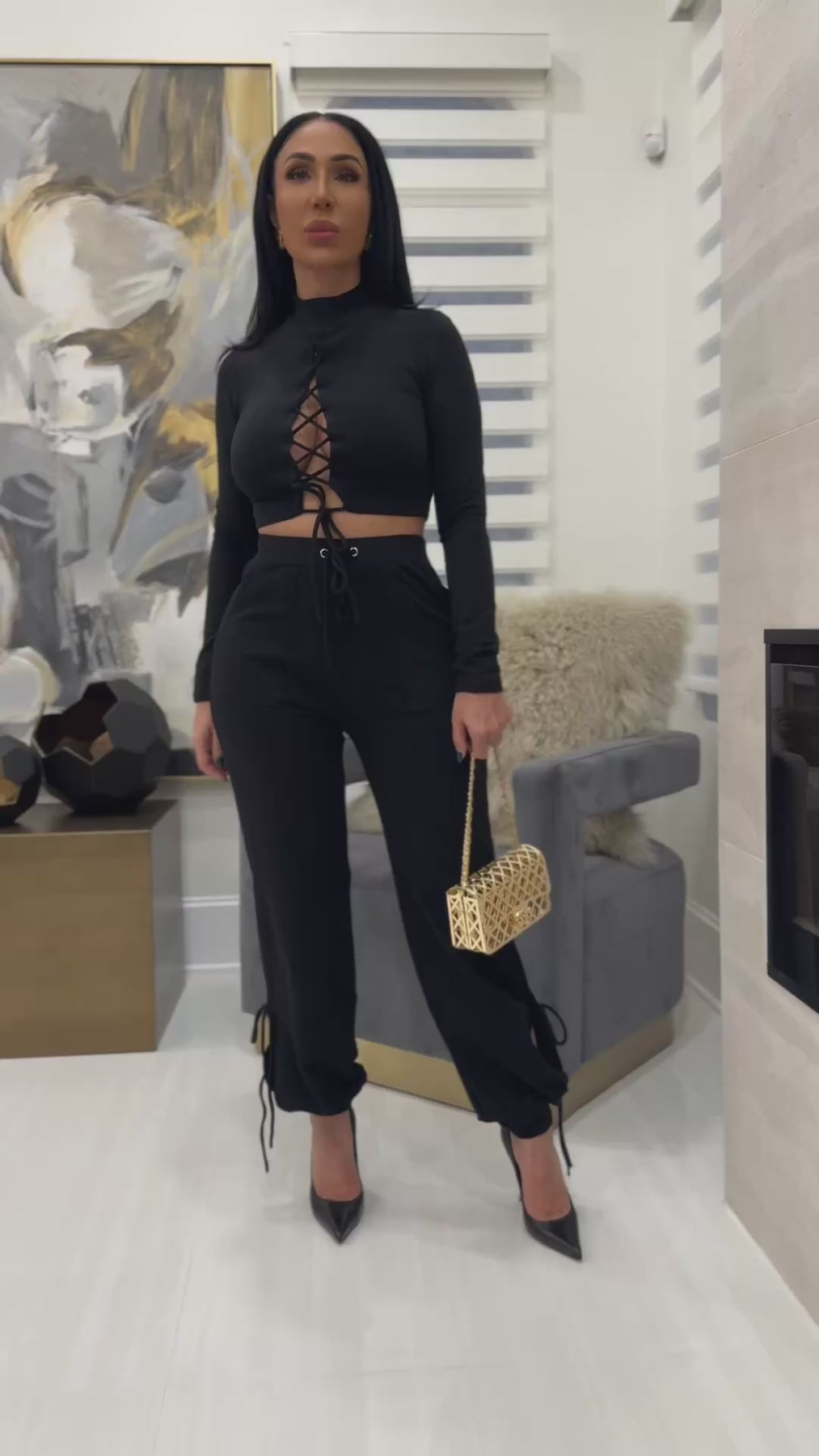 - Long Sleeve Cropped T-Shirt with Front Criss Cross Tie Detail Paired with Drawstring Joggers